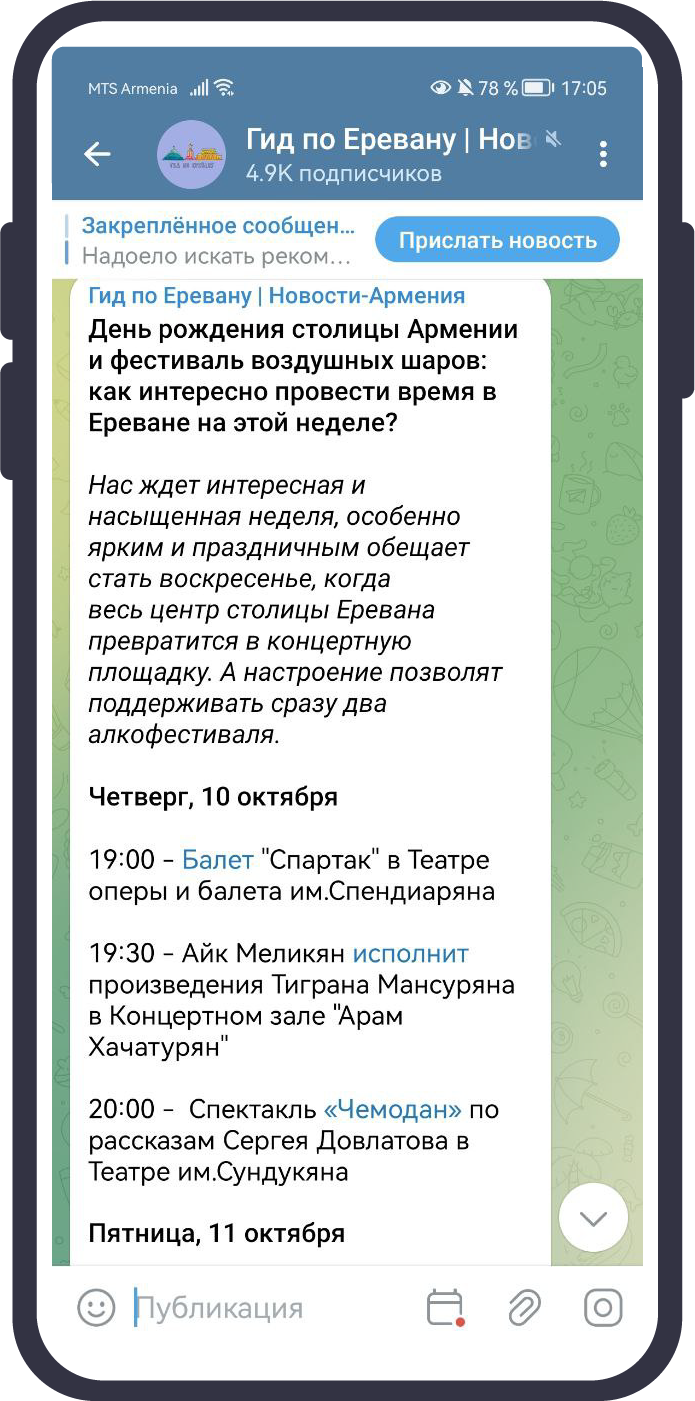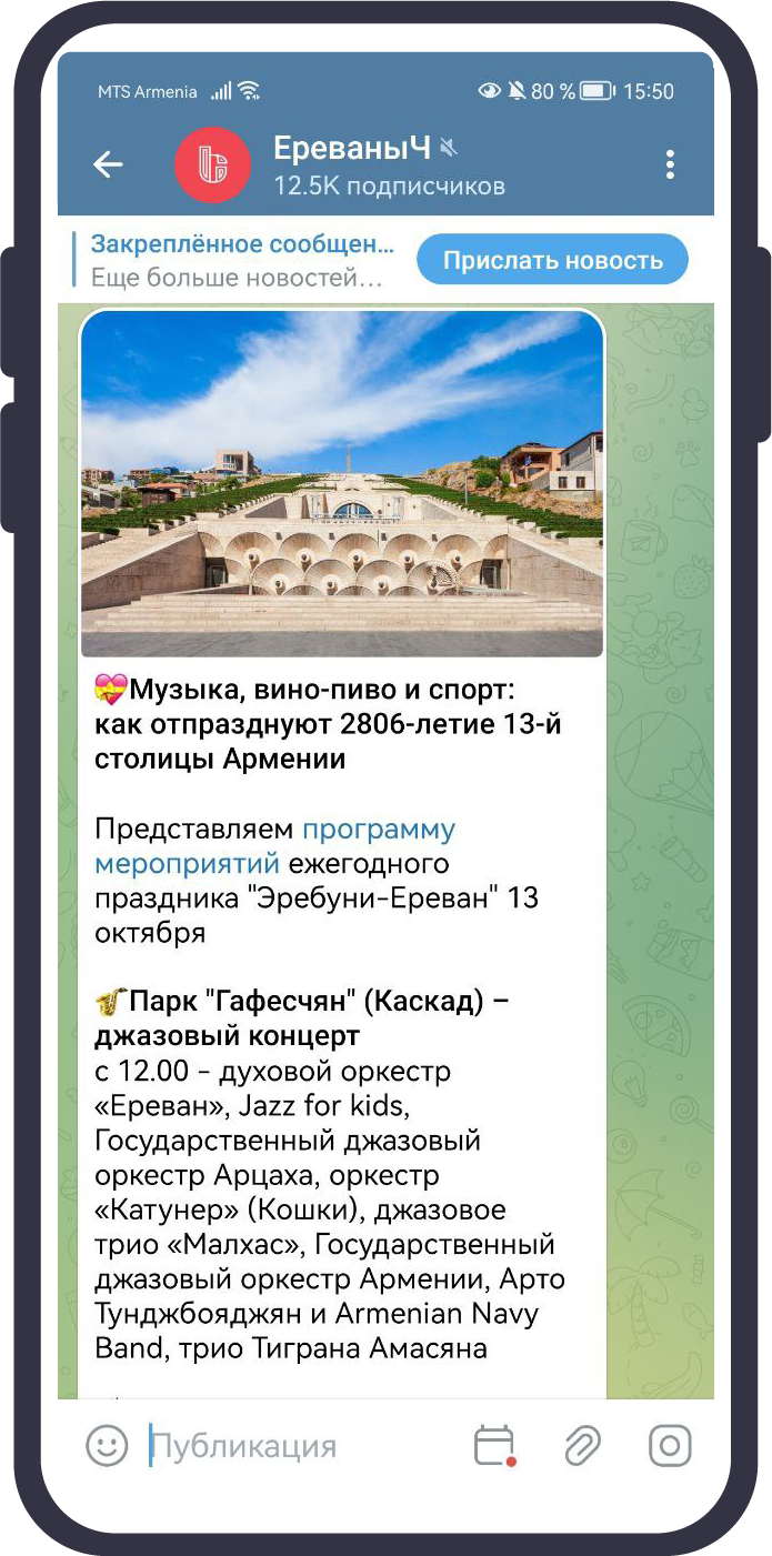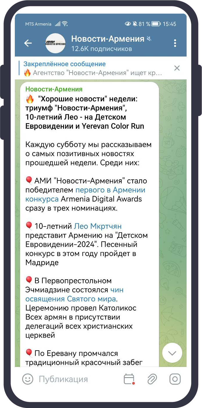 Մեր Telegram ալիքները կոնտենտը խթանելու արդյունավետ գործիք են այն դեպքերում, երբ անհրաժեշտ է արագ հասնել թիրախային լսարանին: Մենք գիտենք, թե ինչ են սիրում Telegram-ի օգտատերերը, հարմարեցնում ենք նորությունները, տեսանյութերը, տեքստերը, ստեղծում ենք գովազդային ինտեգրումներ և նույնիսկ հատուկ նախագծեր մեսենջերի ներսում: